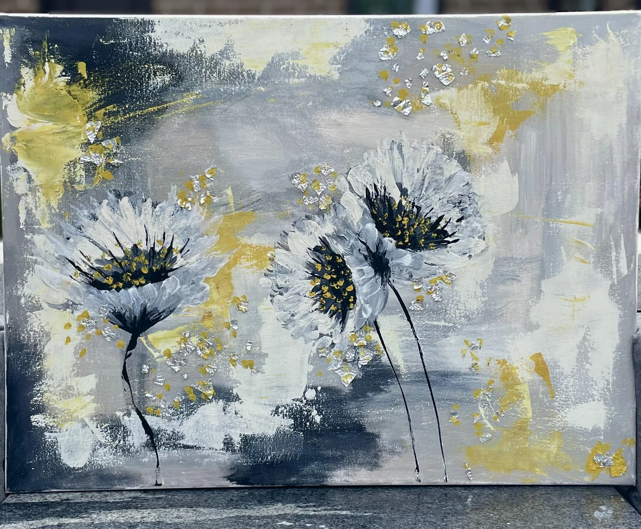 This acrylic painting, treasured by my parents as their favorite, is a symbolic representation of my immediate family. Three flowers symbolize each of the three children, with textured enhanced using tinfoil for a metallic sheen that compliments the silver accents in our home. This art piece was completed in November 2023