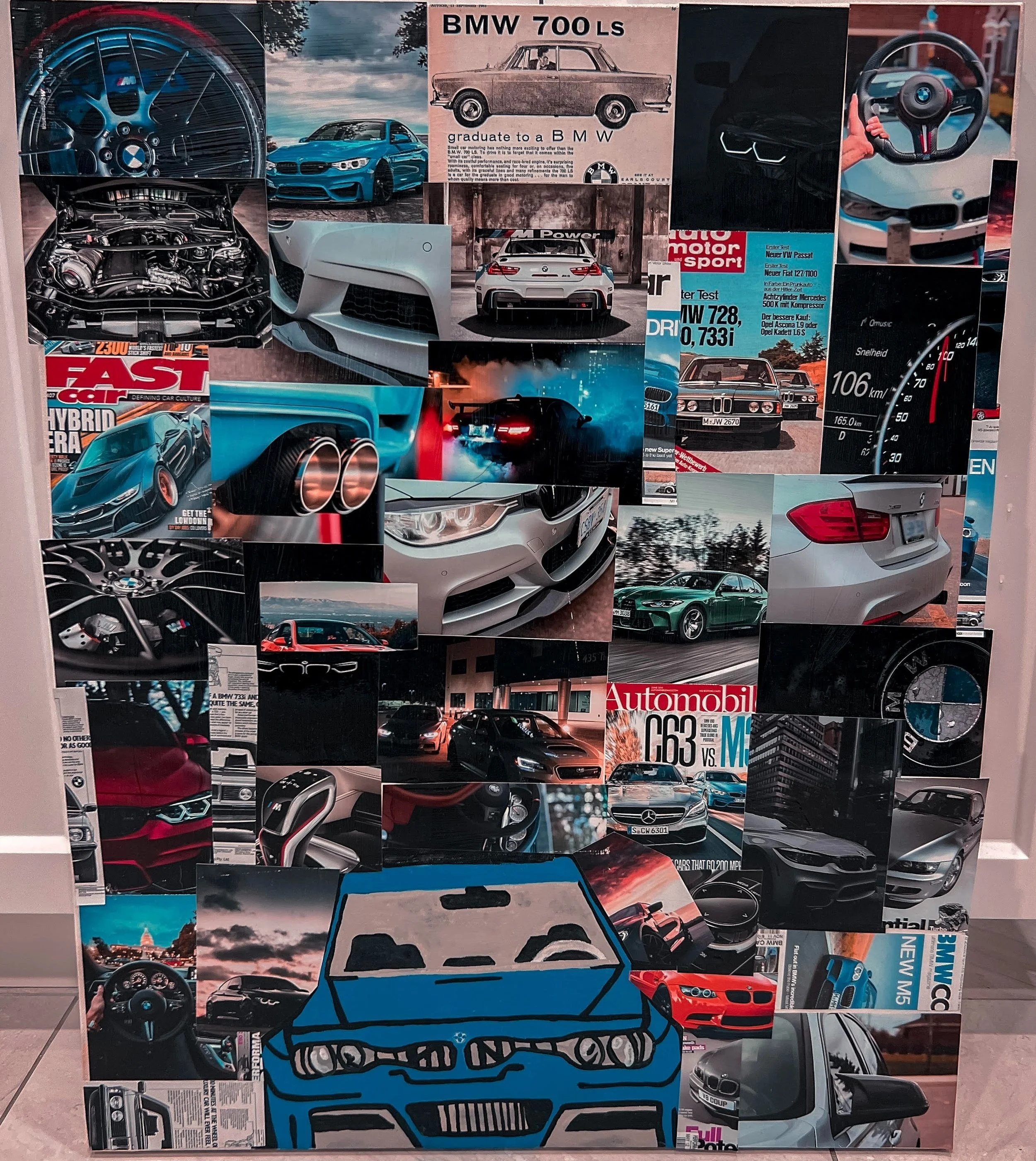 This mixed-media painting is titled “Break My Wallet” for a humorous description of the abbreviation BMW. There is a variation of vintage BMW pictures with a twist of modern luxurious pictures surrounding a chaotic array on the canvas. This symbolizes the ongoing expenses of BMW with a playful automotive nostalgia feel. This piece was completed in late December of 2022.