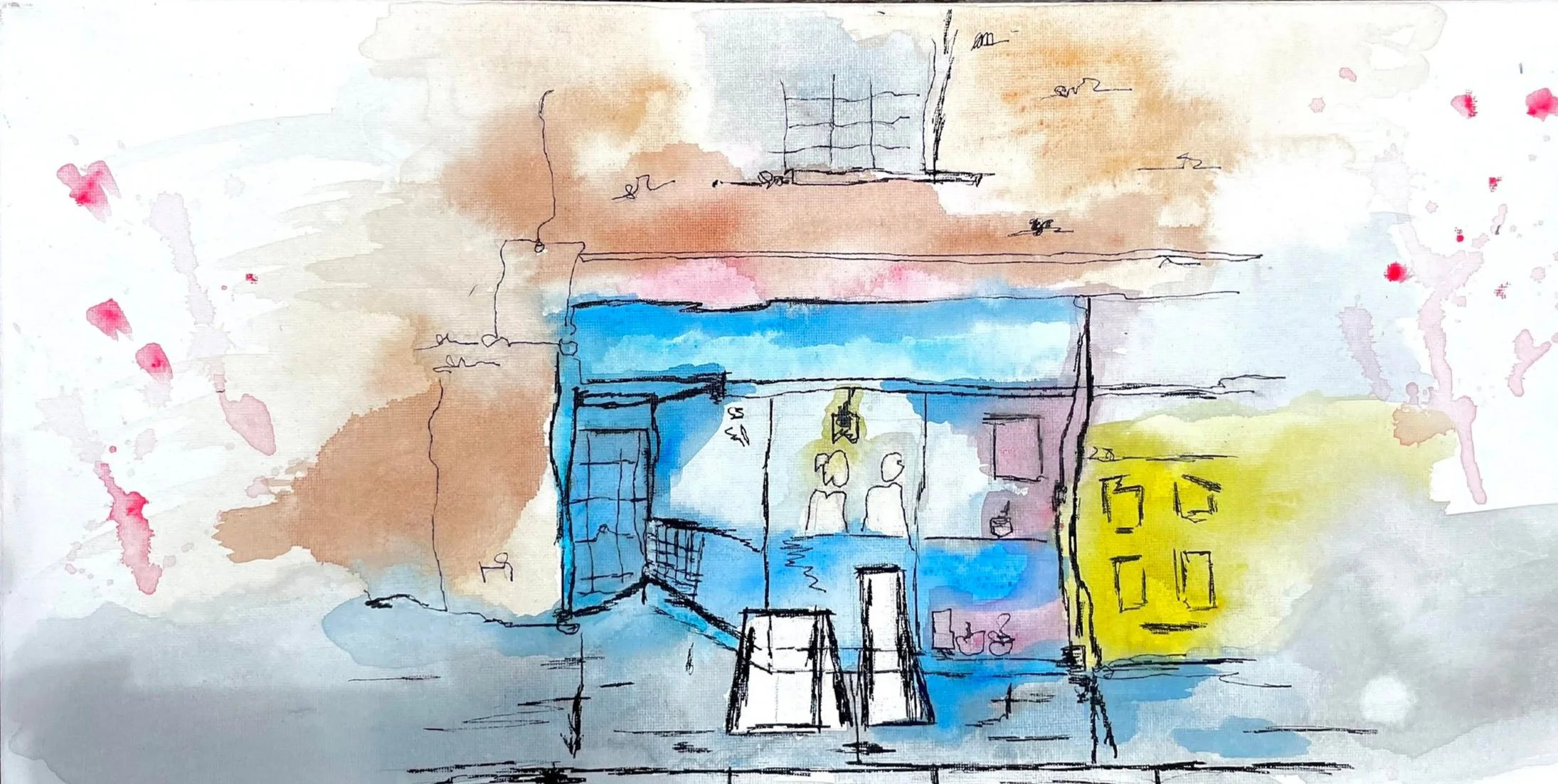 This watercolor urban sketch painting captures a glimpse moment of connection amongst chaos. Two individuals in an overflowing coffee shop surrounded by noise. This painting was my first attempt at an urban sketch and was completed in March of 2024.