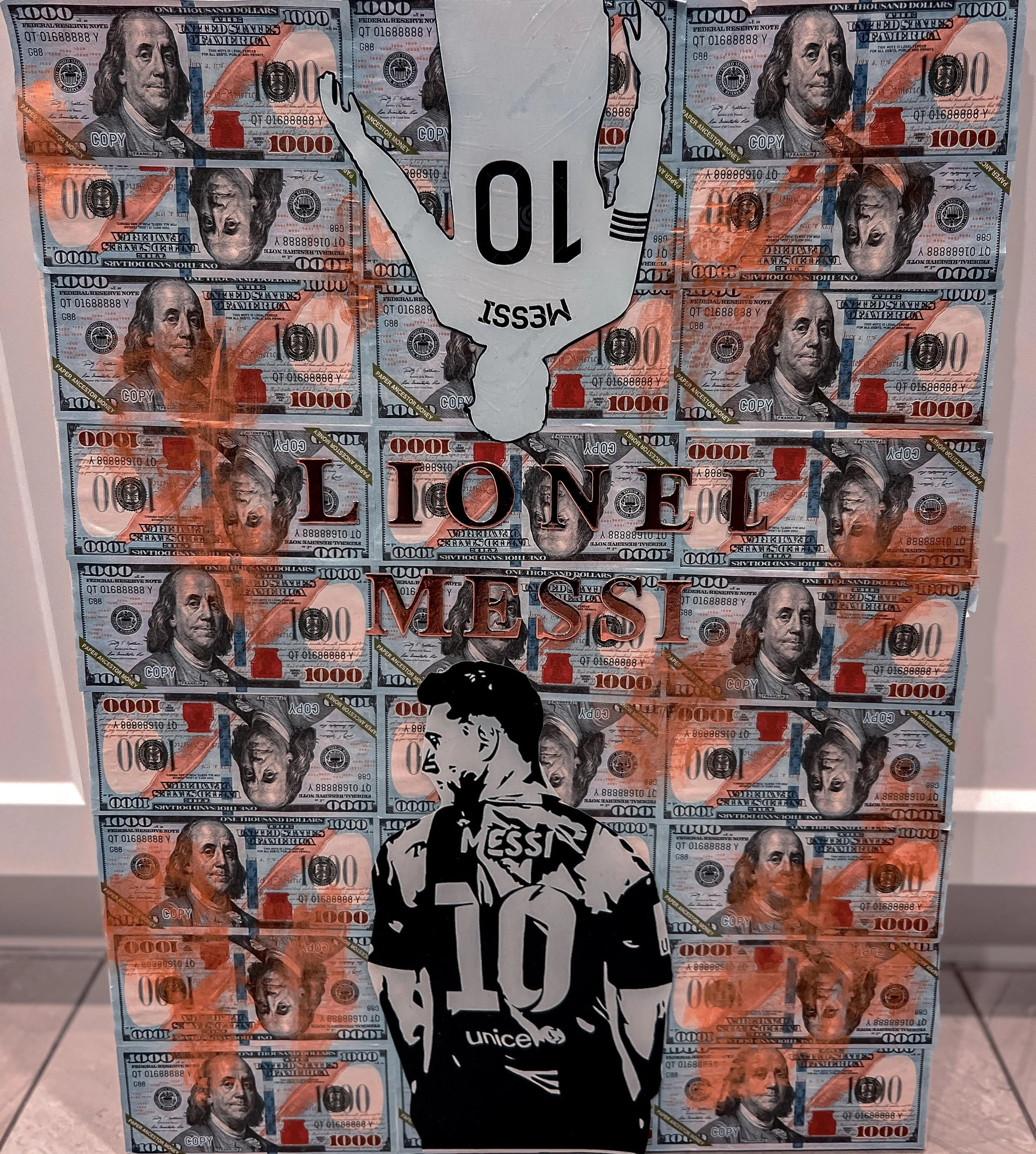 This piece was completed after Argentina won the World Cup in December of 2022. Inspired by the World Cup games I highlighted my personal favourite Lionel Messi. I surrounded Messi with currency symbols and accents of gold, symbolizing his unparalleled financial success and iconic status in football. The artwork features a glossy Mod Podge finish and textured, raised letters on canvas.
