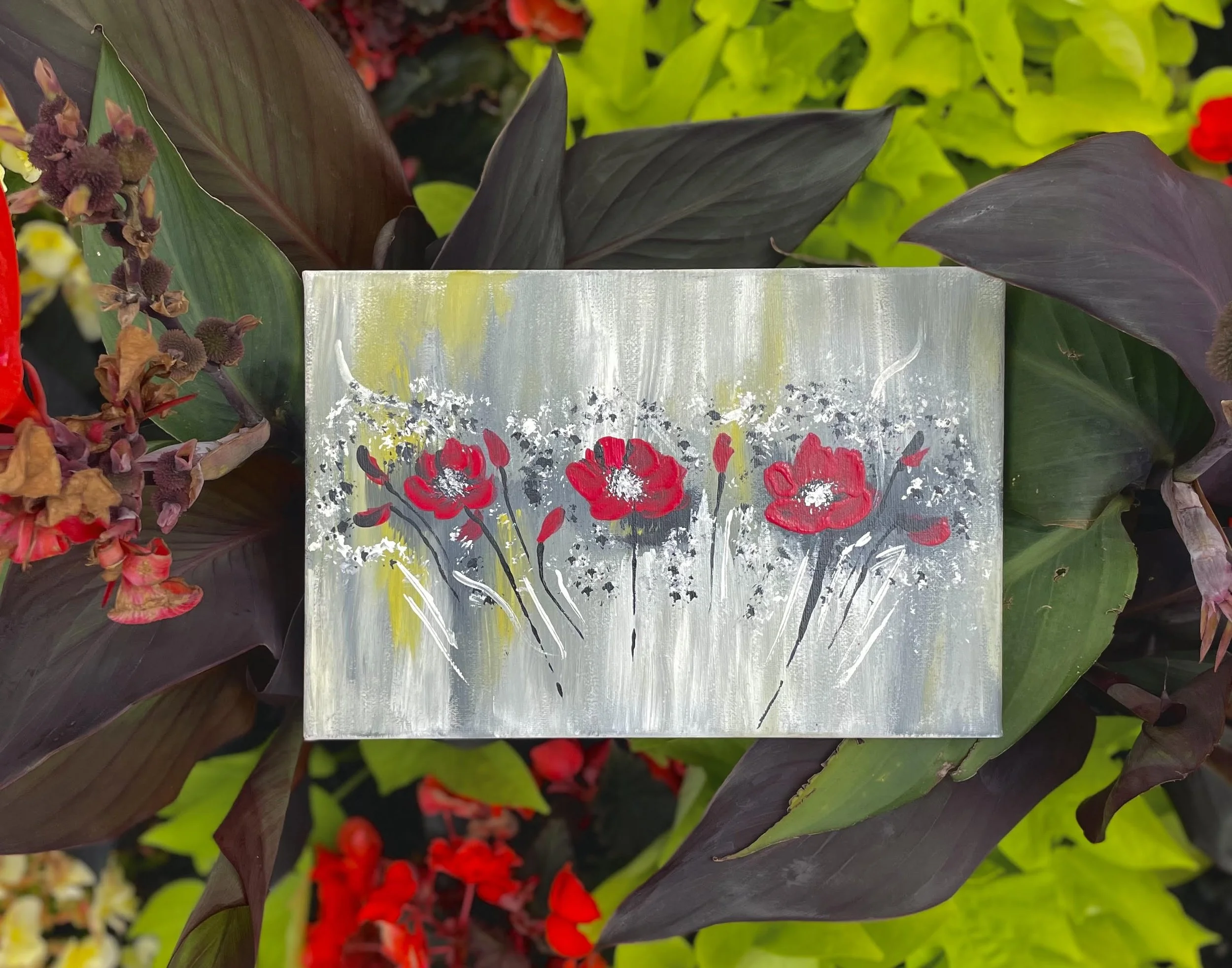 Inspired by memories of my nonno’s vibrant garden and his passionate love for red roses, this acrylic painting was completed in September 2023. This painting captures the essence of floral beauty amongst an abstract background. The lively red roses catch the attention of the viewer and their richness and detail are accentuated by the dynamic of the abstract elements surrounding them.
