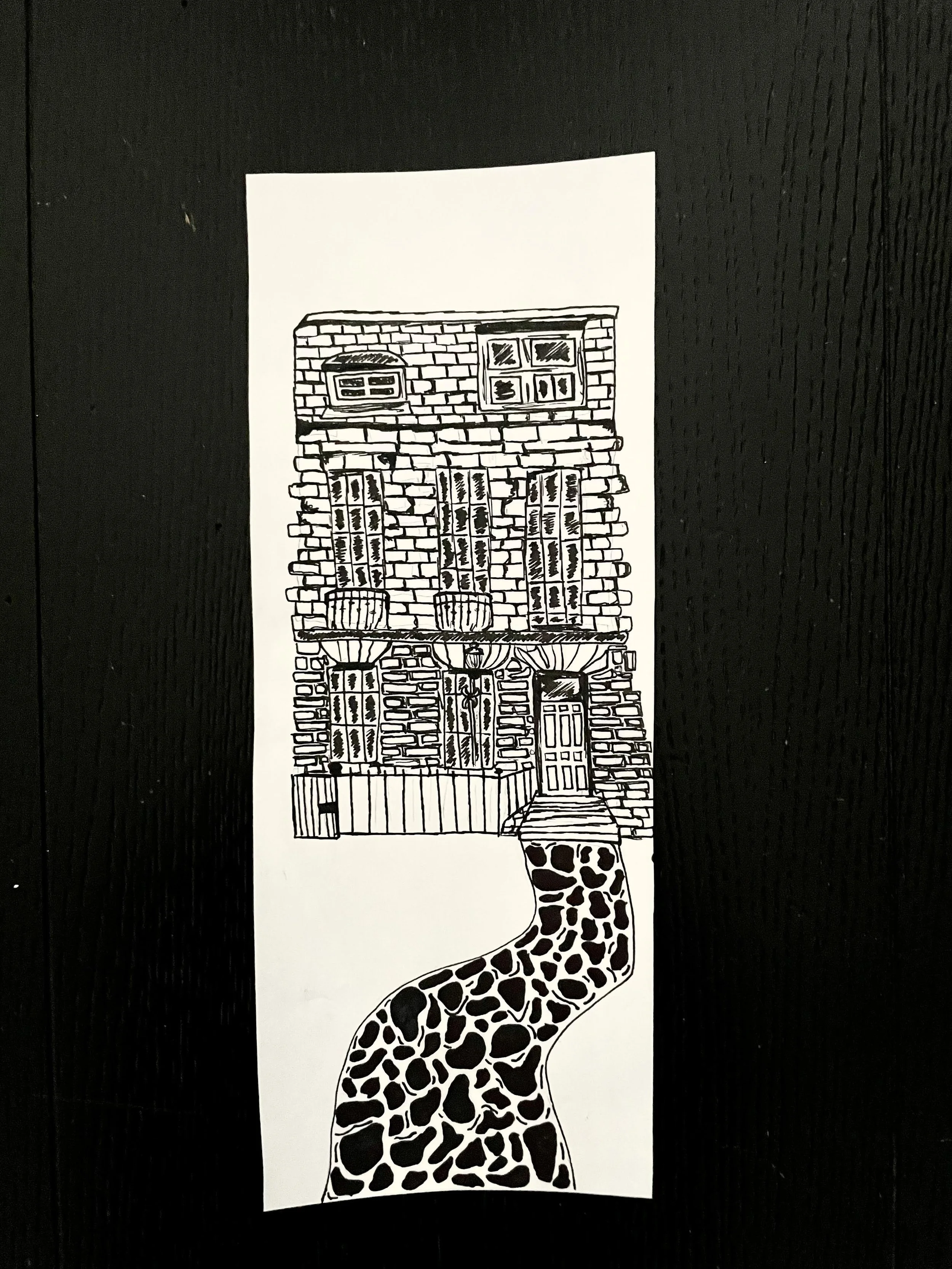 This sketch is a homage to my favorite children's book, "The Giving Tree." If this beloved story had a home, this would surely be it. Through this artwork, I am using a Black uni-ball fine point pen and free-hand drawing each brick and cobblestone. I completed this sketch in January of 2022 right after graduating with My Bachelor's degree in Sociology. At a time when I felt my childhood was escaping me this sketch helped me remember my inner child.